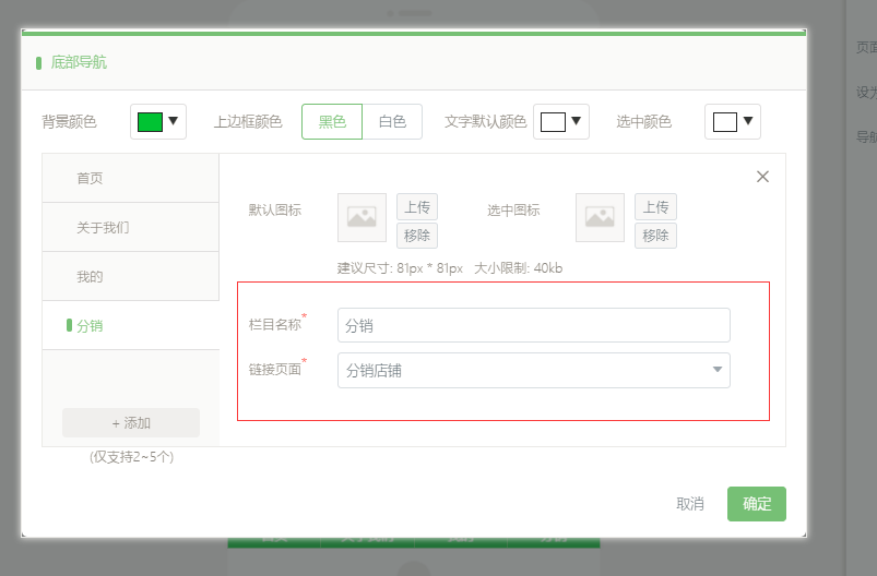 2.在小程序编辑器中,点击“页面管理”-“设置”-“添加”设置分销店铺并将它链接至“分销店铺”页面中,在页面管理中一定要添加“产品详情”页面,然后点击保存即可,点击“我要分销”时,如果用户不是分销商则会出现一个弹出框,点击确定之后,会跳转到注册页面,如图所示: