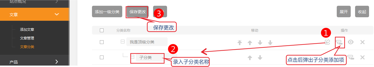 如果需要在顶级分类下添加子分类,直接点击添加子分类即可。